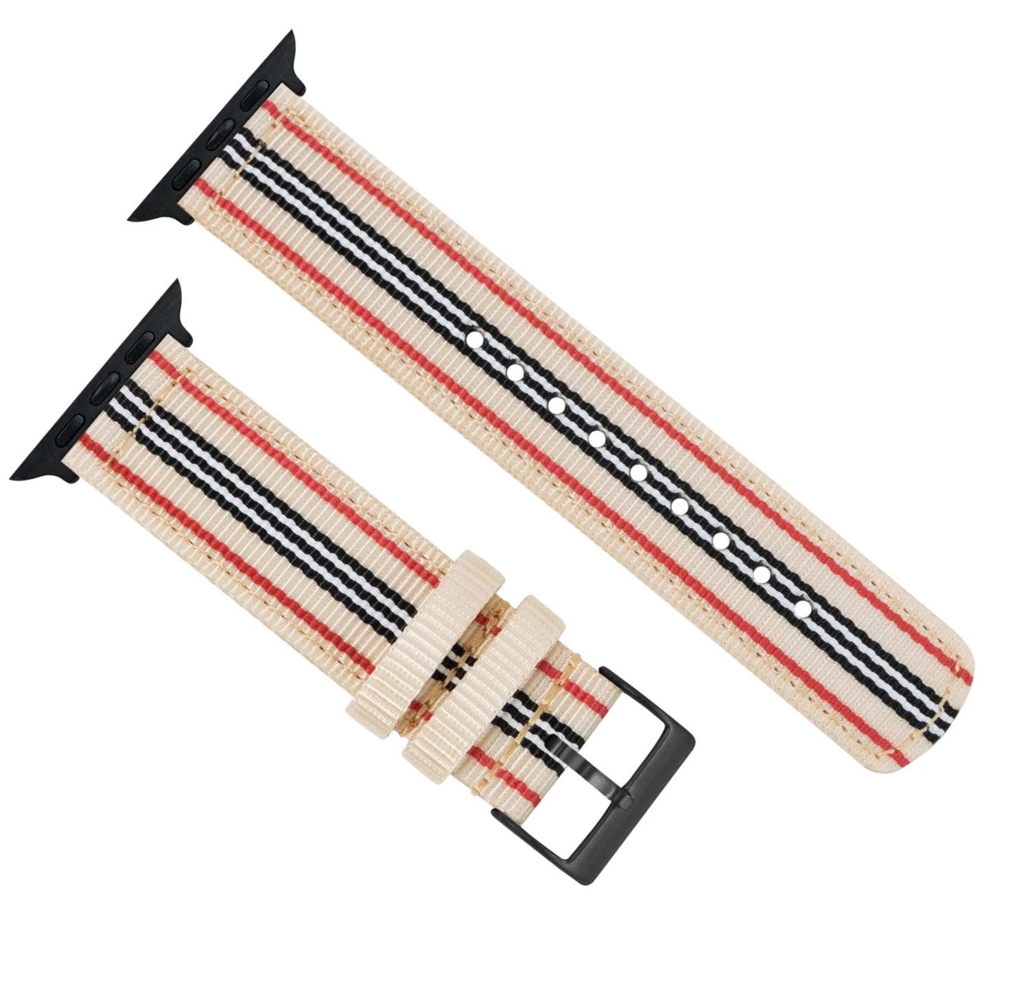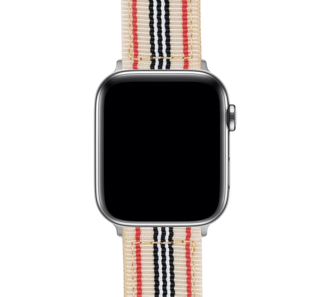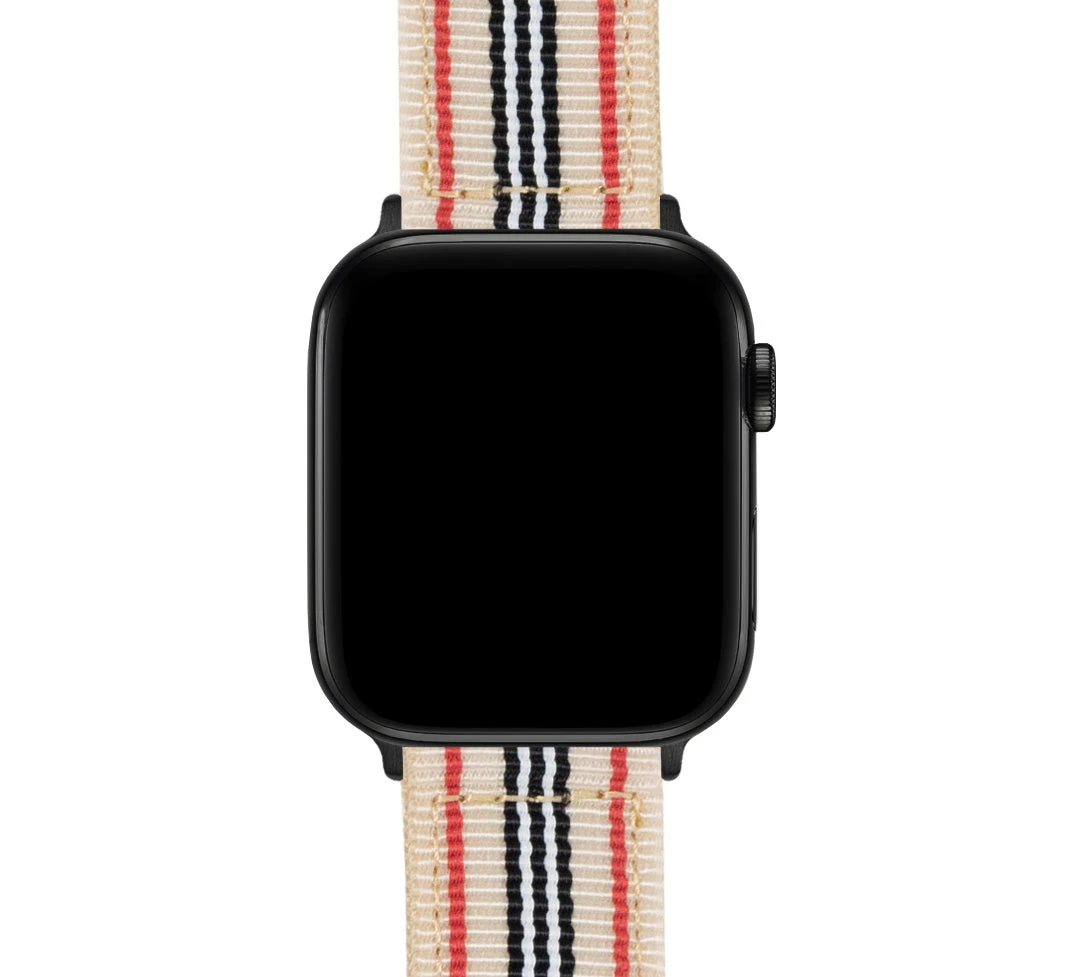 Our Two-piece NATO-style Apple Watch bands are sure to add character and comfort to any Apple Watch. Our nylon straps are water-resistant, colorfast, and feature two nylon keeper loops for a more comfortable fit. Please be aware that due to the sturdy dual-layer construction, our two-piece NATO-style straps do have a stiffer feel that softens up over time.